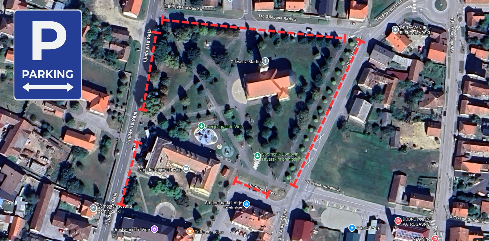 Po dolasku u Virje do nas ćete najlakše doći Ulicom Ljudevita Gaja ili Ulicom Đure Sudete. Parkiranje se ne naplaćuje. Mjesta za parkiranje ima u obje ulice, a označili smo Vam ga na karti.