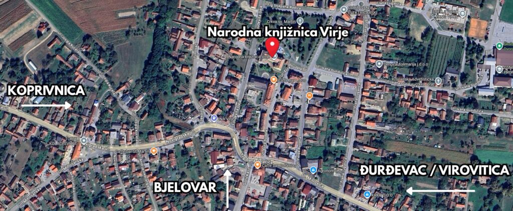 Ako u Virje stižete autobusom, on će se zaustaviti na stanici u centru, nakon čega Vas čeka samo kratka šetnja od 3 minute do knjižnice. Ako stižete na željeznički kolodvor, molimo Vas da nam se javite jer je Željeznički kolodvor u Virju ipak dosta udaljen pa ćemo Vam organizirati prijevoz do knjižnice.